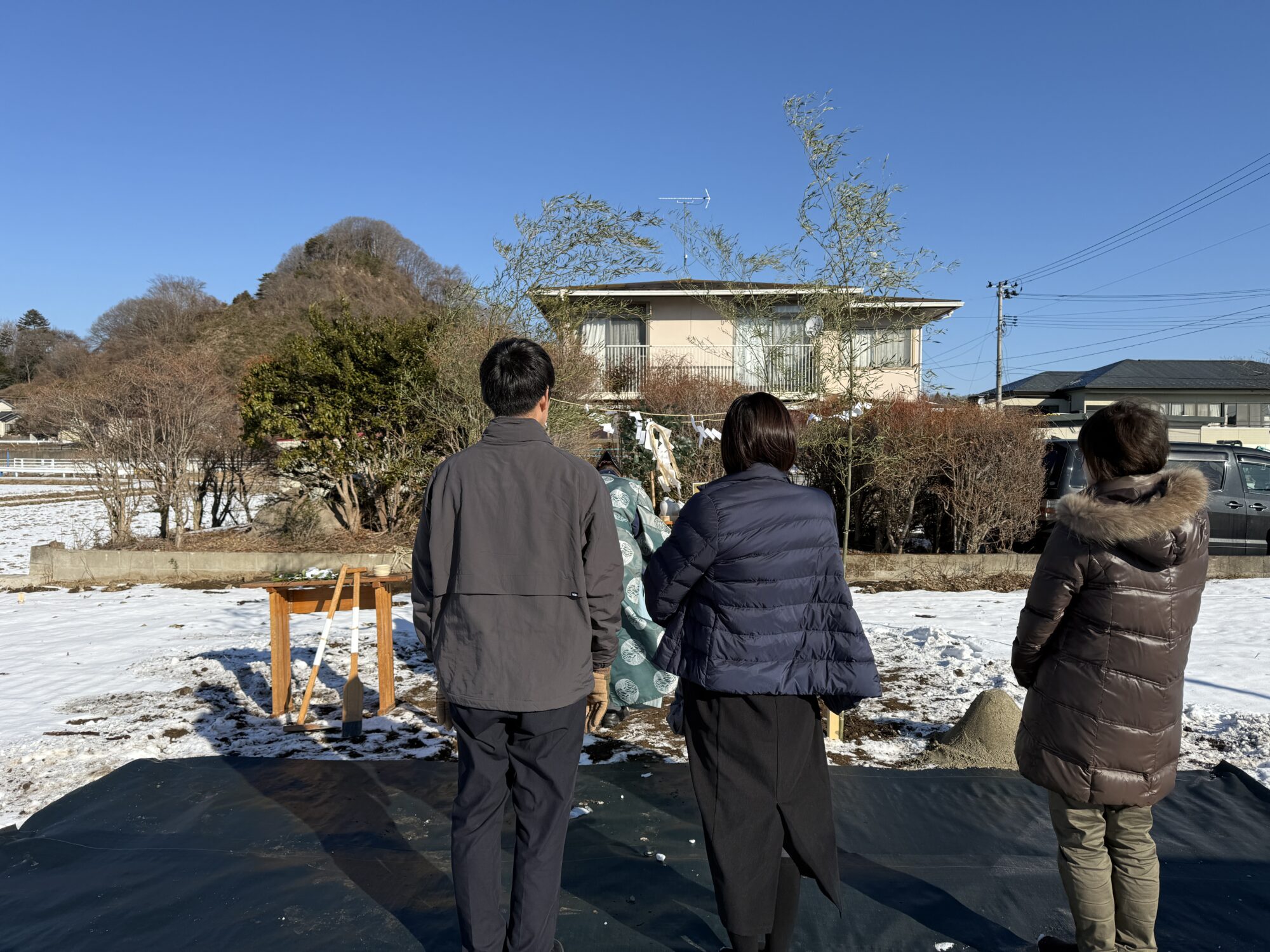 当日は天候にも恵まれ、澄んだ空気の中で式を迎えることができました。地鎮祭は、工事の安全と建物の完成、そしてそこで過ごす人々の繁栄を祈願する大切な儀式です。改めて身が引き締まる思いで参加しました。